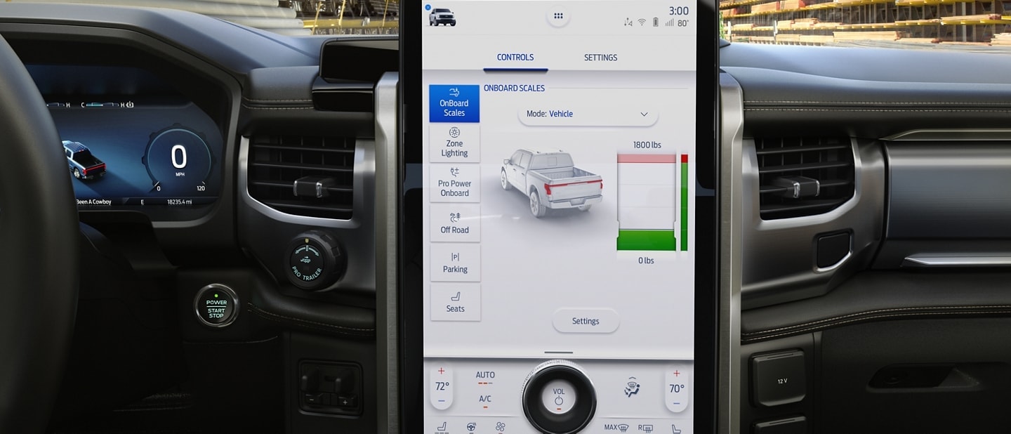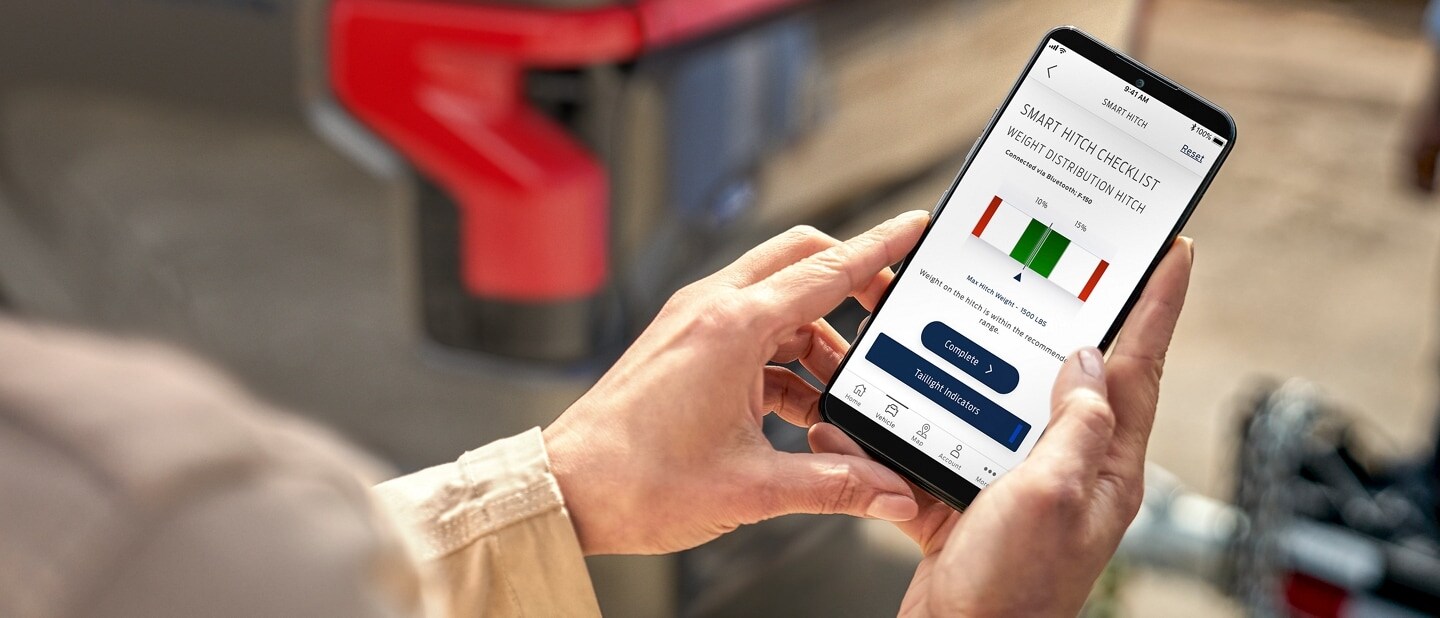 It measures the tongue weight of the trailer through the connection process. Calculating the appropriate weight, it guides weight distribution onscreen with the FordPass App™ or on your SYNC® screen.
